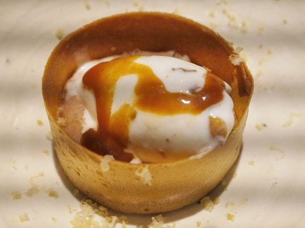 ●カラメルソース、ガナッシュ、黒糖のテュイル