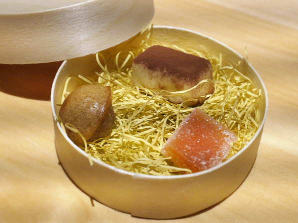トマトのパットドゥフリュイ、白チョコレートガナッシュ、フィナンシエ。
