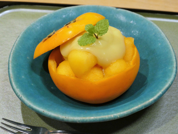 ●最後はおなじみ定番の秋のデザート、柿に栗ソース。秋×秋でこれたまらん。