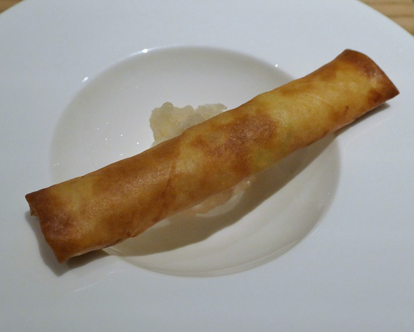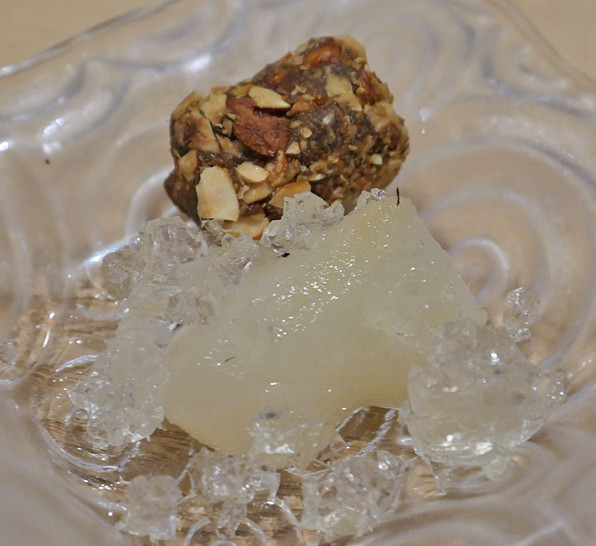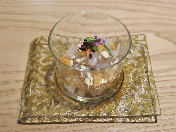 ●中華風お造りは、かわはぎ、くらげ、大根、ルバーブ。上からカシューナッツ、くるみ、ワンタンの皮をパリパリに揚げたのなど。