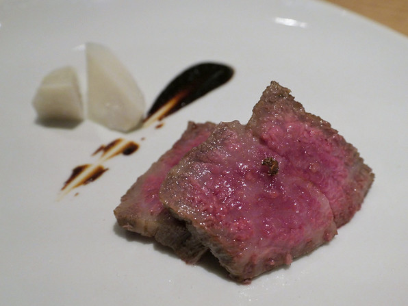 ●近江牛と里芋。甜麺醤。牛肉の上に四川山椒。