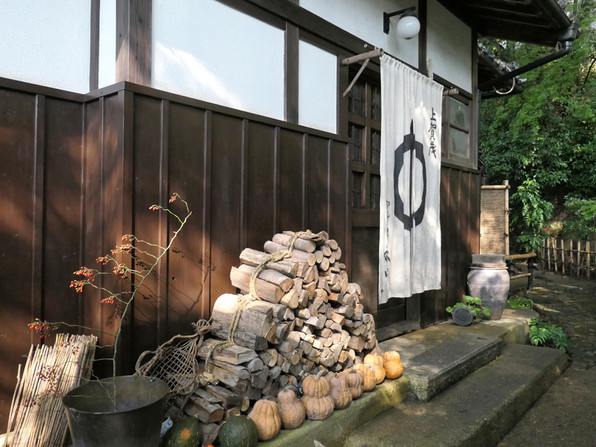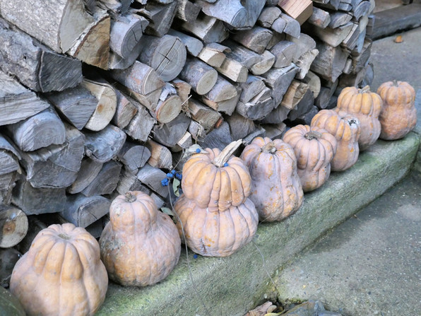 ★★入り口に積み上げられた薪の前に並んでいる鹿ヶ谷かぼちゃ、これハロウィンの飾りだったんだって\(^o^)/\(^o^)/