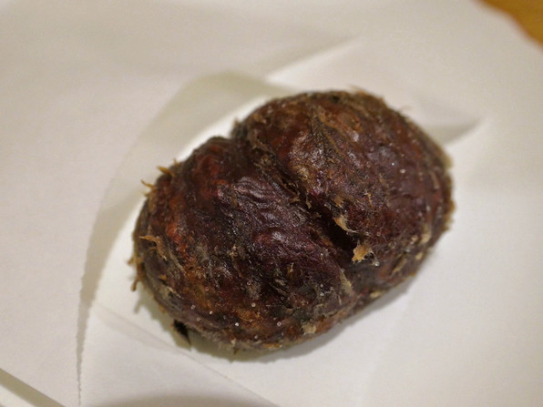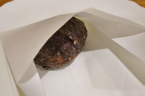 ●丹波栗の渋皮ごと熱々をほおばるアミューズです。小さな紙の袋に入った状態で供されました。