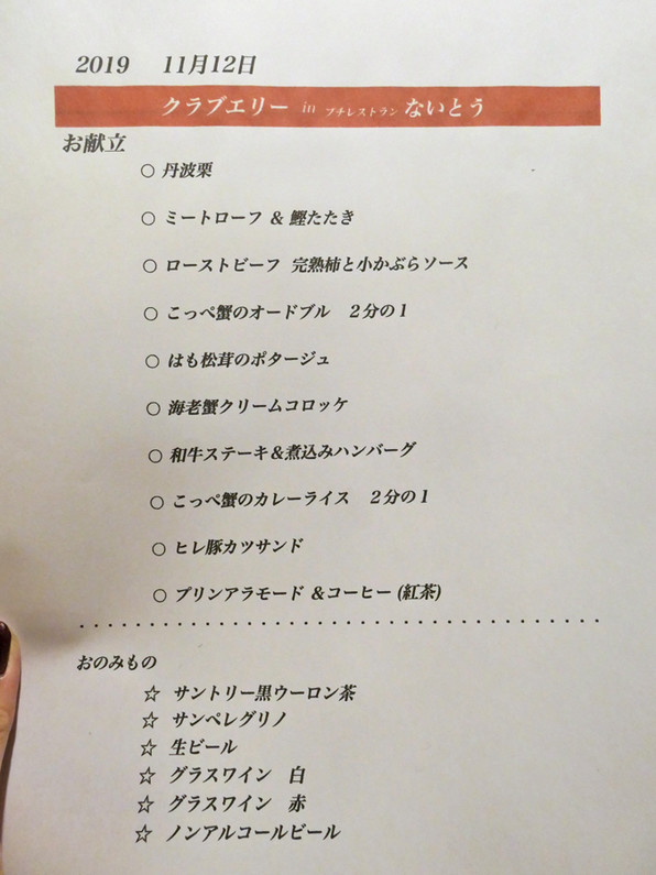 11月12日(火)昼のクラブエリーは、移転準備中の「プチレストランないとう」さんにお世話になりました。カウンターとお座敷に、みっちりお邪魔しました。