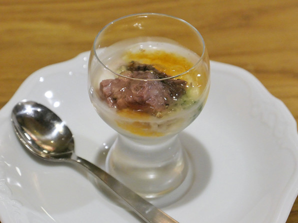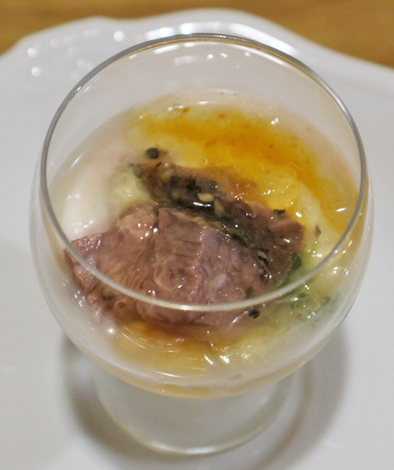 ●ローストビーフはまさかのグラス入りで、かぶらのピュレなどと合わされて繊細優美な味、