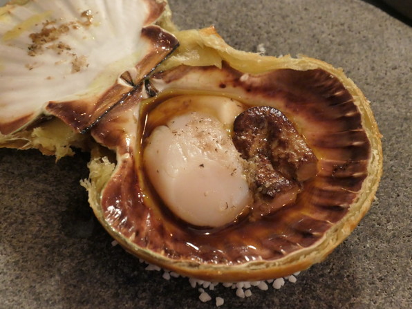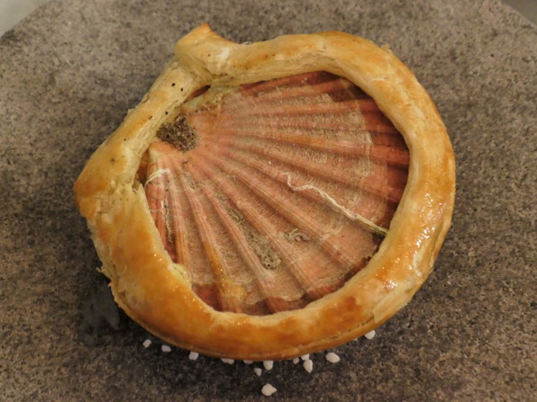 ●前菜1 帆立の貝殻を使って、帆立、セロリピュレ、フォアグラ、黒トリュフ。パイ生地で包み焼き、その生地旨い。