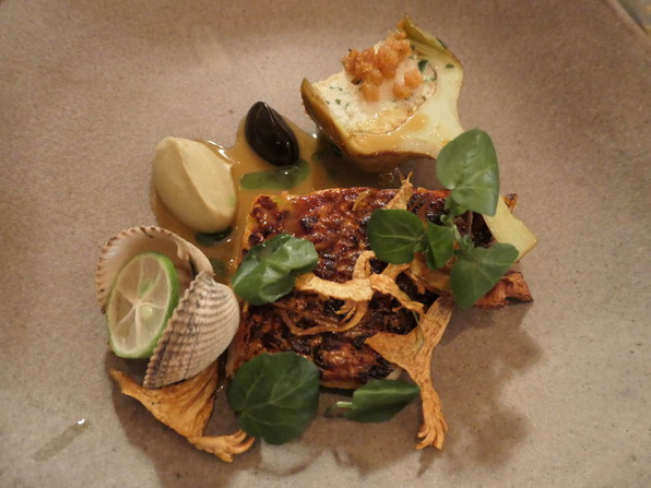 ●ルージェ(ひめじ、地中海からとのこと)アルティショー魚ムース詰め、黒にんにくピュレ(こちらでも黒にんにくね)