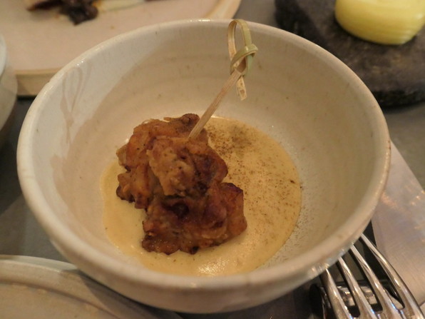 ●別皿でカフェ風味のエスプーマに鶏のフリット=完全に日本の唐揚げ。