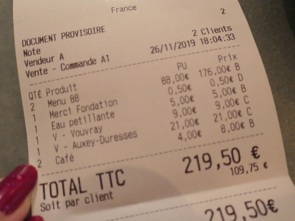 ●発泡水と1グラスワインでひとり120ユーロとか。