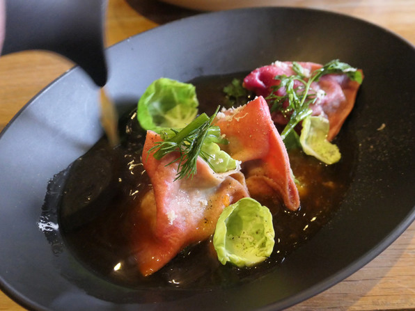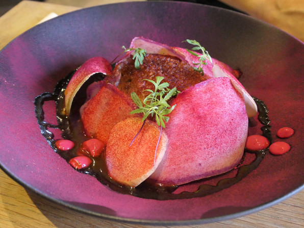 veauの方はかぶらやべトラーヴの赤で、テーブルの上の色がきれい。魚の火の入れ加減なんかもすごく今風で、すっきりしたお料理でした\(^o^)/\(^o^)/
