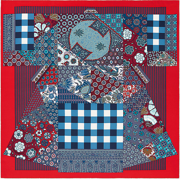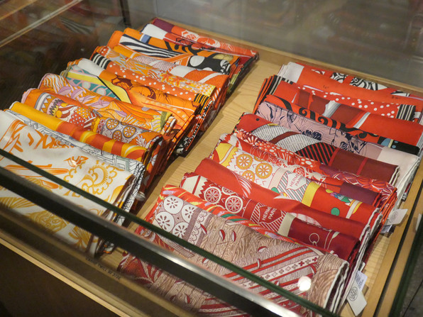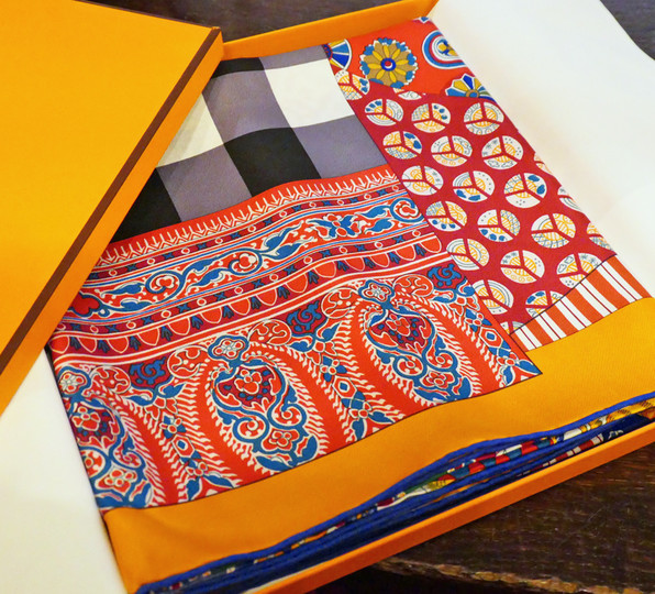 ●敬意を表して、90✕90、標準のシルクツイルを一枚購入です。ふちはオレンジ。全体の色柄にほれぼれして、結局赤のカテゴリーからは選ばずでした。
