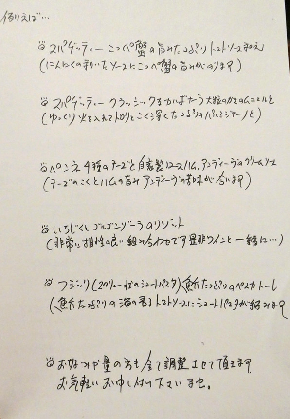 (スープ、旬の魚盛り、蟹クリームコロッケ、魚料理、肉料理、パスタ、デザートなど)