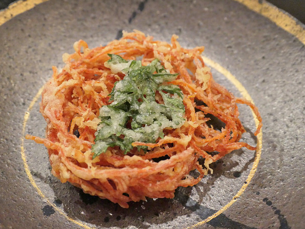 ●今回特に感じ入ったのはごく細切りにしたにんじんの天ぷらで、さくさくさくの加減とにんじんの自然な甘みは天国だーと思いました\(^o^)/\(^o^)/