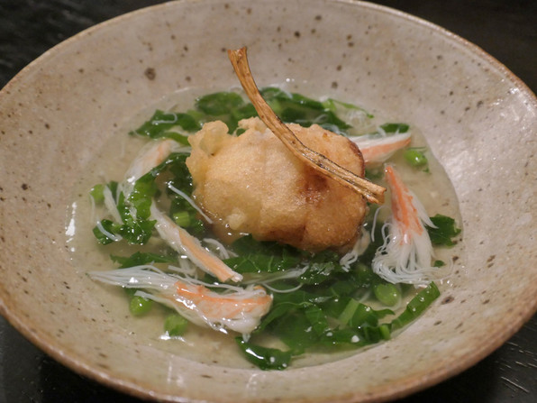 ●小蕪の天ぷらに、紅ずわい蟹の身たっぷりのあんかけ。