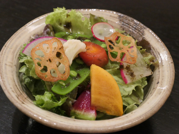 ●季節野菜のサラダ、ノンオイル赤紫蘇のドレッシング。柿が甘みを添えていました。