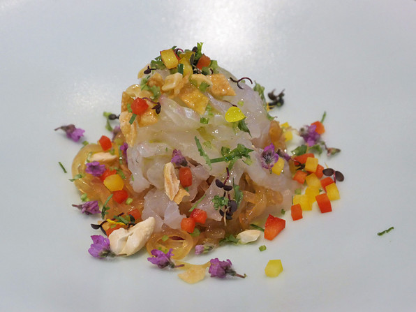 ●静華魚生、お刺身はひらめです。ナッツや野菜やハーブで彩りも食感も楽しいお皿です。