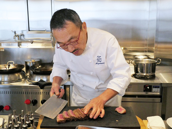 ●カウンター中央が店主の宮本静夫さん、手前が二番手・酒井研野(けんや)さんです。