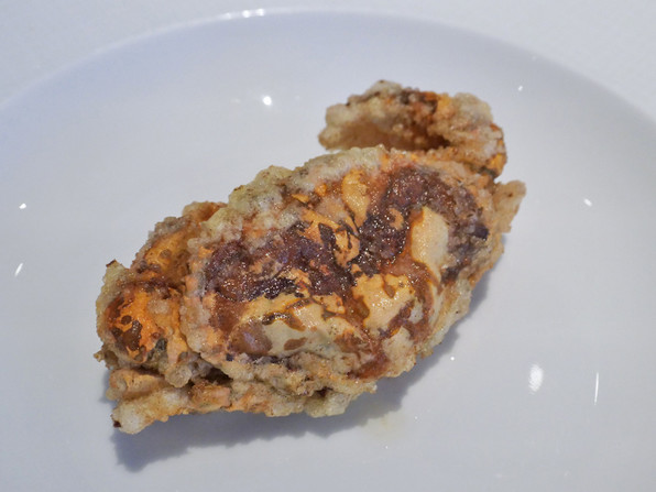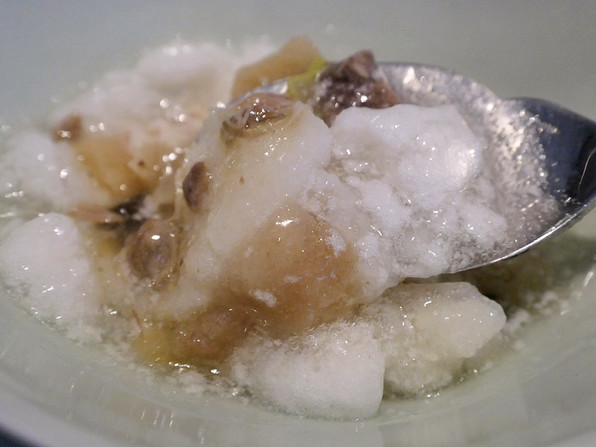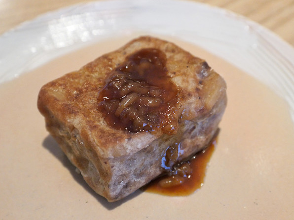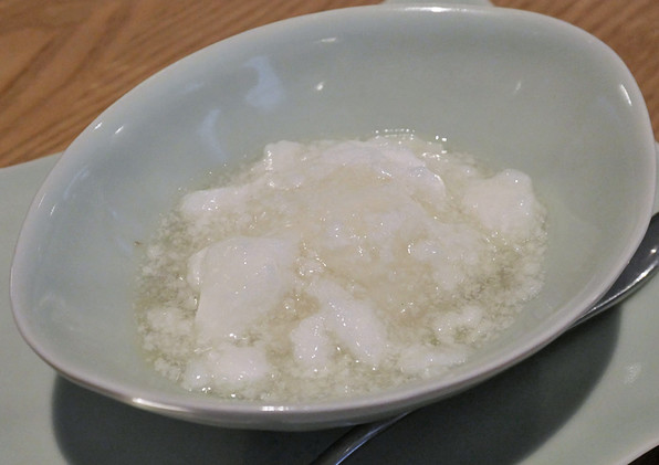 ●聖護院のかぶらで、みぞれというか、かぶら蒸しのような食感のお皿。中にたらの白子、くらげ、衣笠茸、すっぽん、ふかひれ。しんそこ美味と思いました。