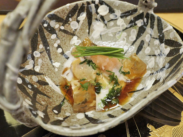 ●ふぐの焼霜とも和え 柑橘醤油 芽ねぎ、てっぴ煮凝り、一味おろし。
