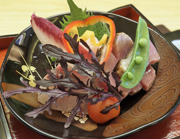 ●ジュレがかかっているのが、酢締めにしたさわらの藁燻製に赤かぶ、水菜、土佐酢のジュレ。