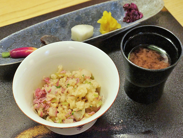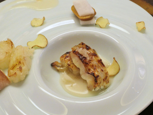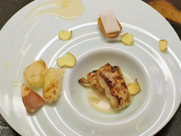 のどぐろ西京焼き、百合根ソース。信長ねぎとあやめかぶの天ぷら。くわい煎餅。からすみ大根。
