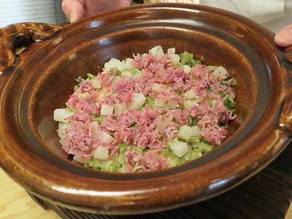 ●大根ご飯です。白い大根、紅芯大根、紅しぐれ大根に、それらの葉、揚げた大根。色きれい、食感楽しい、大根でこれほどの味わいが楽しめるかと思いました。