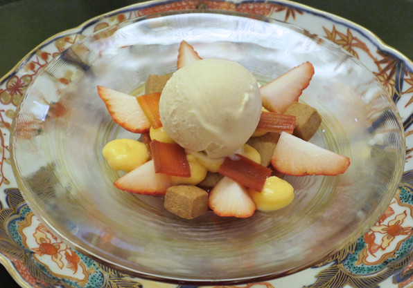 蕎麦を使ったグラスやサブレに、リュバーブやグレープフルーツが合わされたもの。酸味が明確なデセールです。