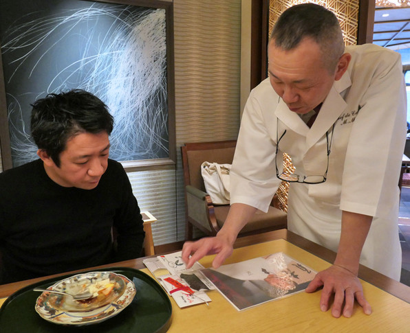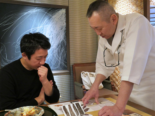 ●二条城近くの料理店の店主さん、昆布について三浦さんから学ぶ之図。