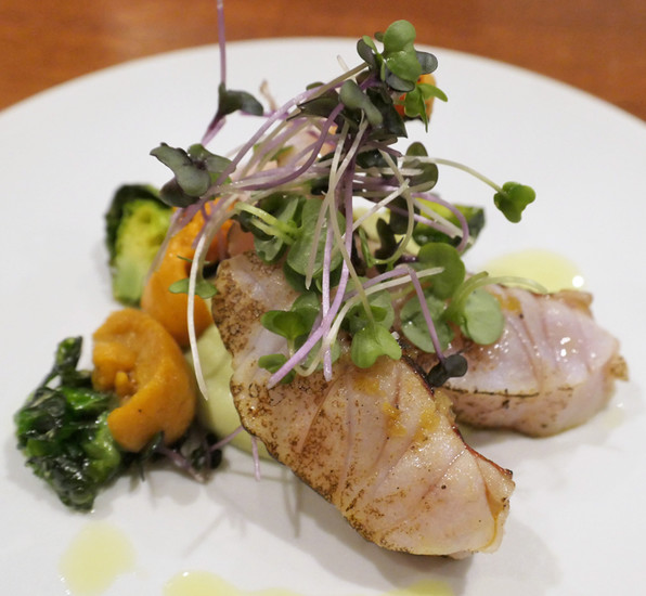 ●わたしは金目鯛を炙ったもの、雲丹。ロマネスコのピュレ(味はそら豆とそっくり)、芽キャベツの素揚げ。