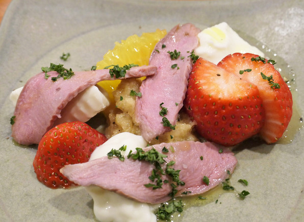 ●鴨肉と日本のフレッシュチーズ。先週と違うのはいちごが添えられていたことです。「マルシェノグチ」さんから仕入れた「やよいひめ」というものだそうです。