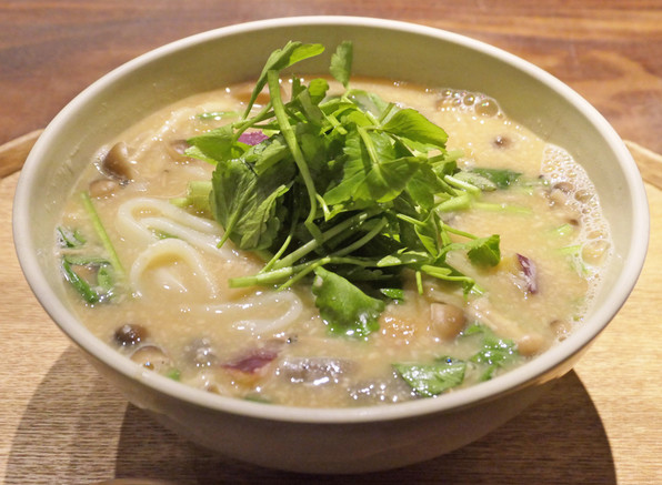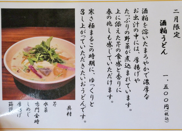 ●2月はこれ。2月限定の 酒粕うどん です。熱々で、おだし濃厚で旨味たっぷり、具材もみっちり入っています。