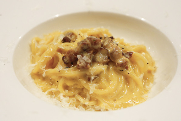 ●そして締めパスタにカルボナーラ。例の うに入り濃厚うにカルボナーラ ではありません。(グアンチャーレではなく)ベーコンのカルボナーラ。