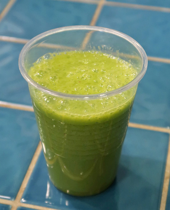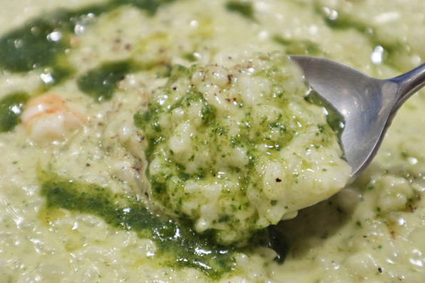 ●アスパラガスと海老のリゾットに、バジルソースをしゃーっと回しかけてもらったもの。
