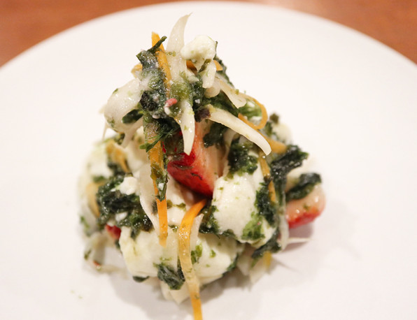 ・うるい、こごみ、せり、菜の花、平貝に、すだちのジュレ。上にいくら。