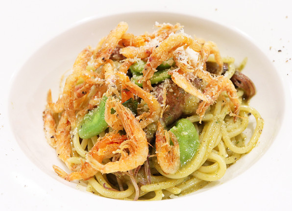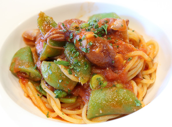 スパゲッティ ほたるいかとスナップえんどうの軽いトマトソース和え