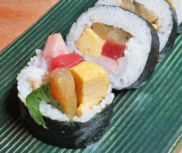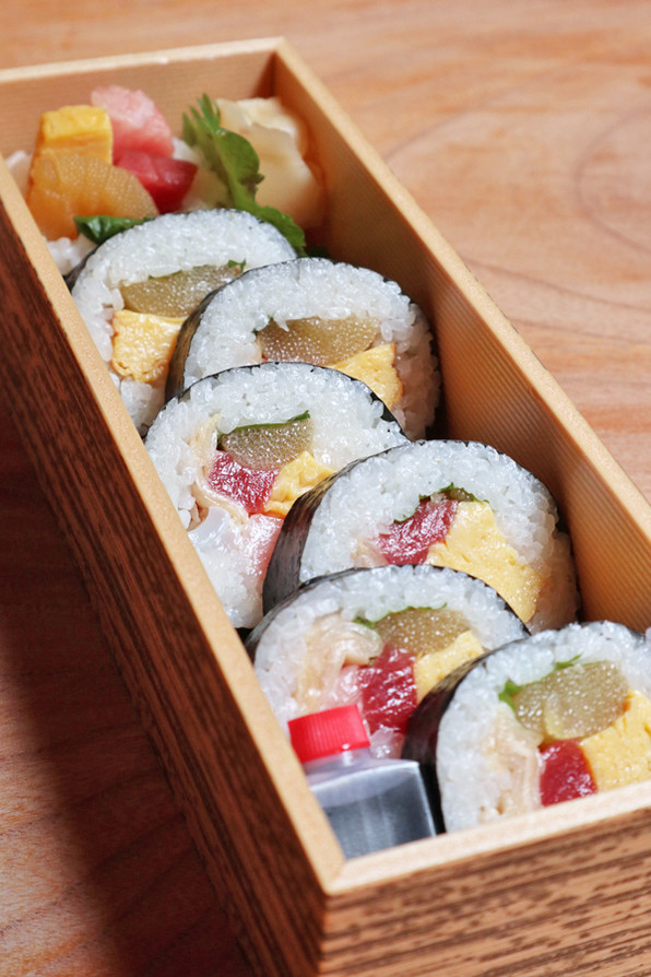 とろに赤身、数の子、玉子、いか、ガリがぐるりんと巻かれてゴージャス感あり。