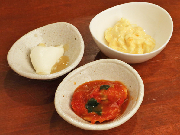 ●カップに入っていた、マスカルポーネとはちみつ/大原山田農園の卵のタルタル/はまぐりのトマトソース