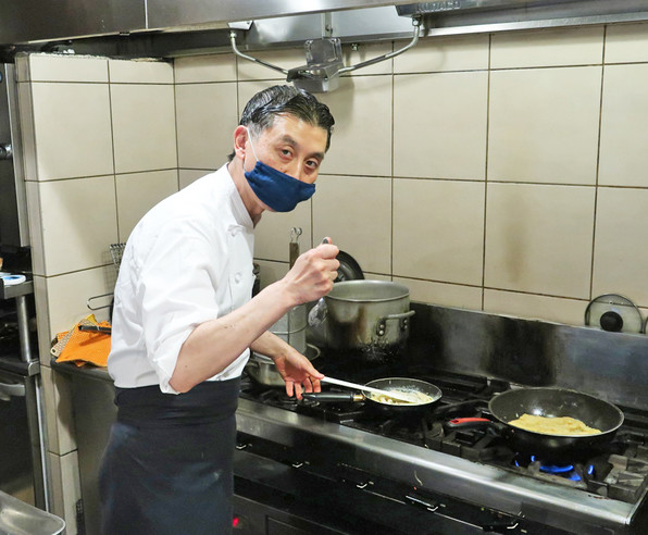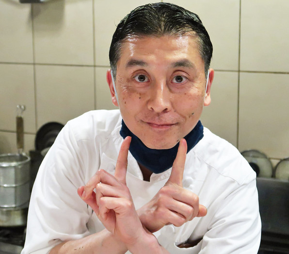 ●シェフの森博史さん、青いマスク姿で仕事されていました。テーブルに予約の料理いっぱい、次々お客さまが入っていらして、人気のほどが改めてわかりました。
