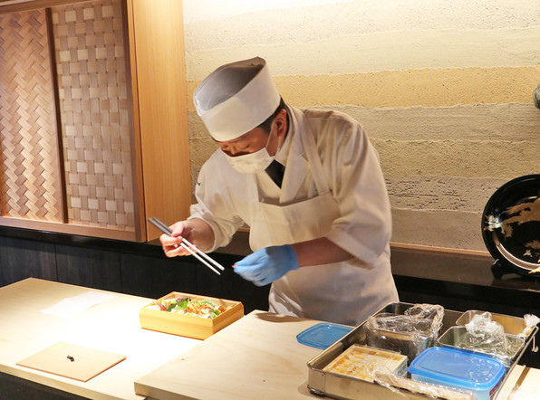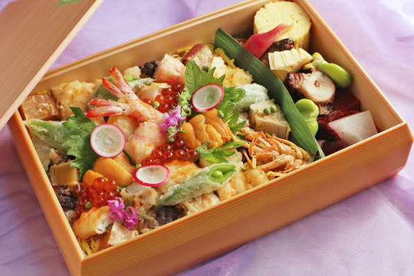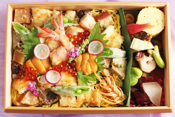 ●4月1日に開店された天ぷらの「ぎをん 藤」さんがスタートされた、持ち帰りの天ばらちらし弁当 5000円(税込み)です。