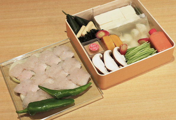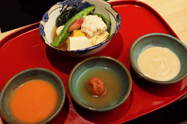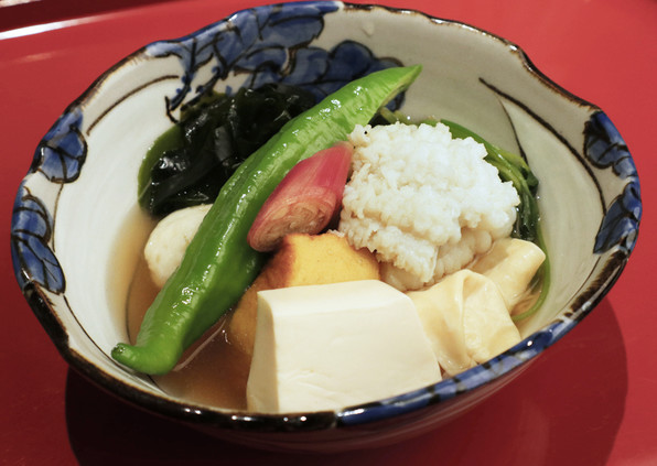 ●豆腐、しんじょう、湯葉、南瓜麩、椎茸、三つ葉、みょうが、わかめ。笹の葉に包まれているのは梅干しです。