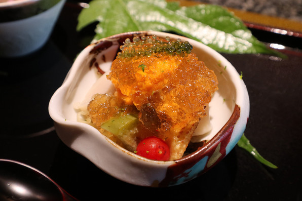 ●夏野菜、煮帆立、雲丹、酸味のジュレ、ふり柚子
