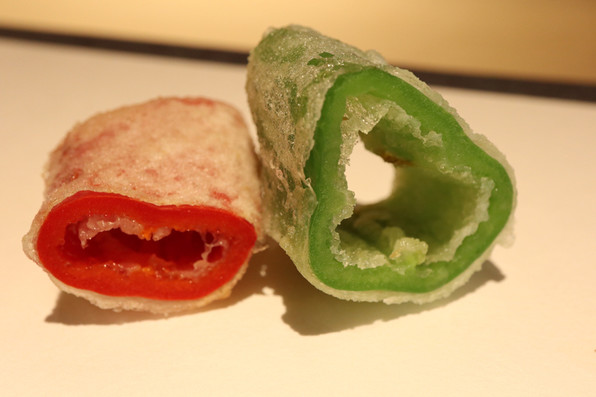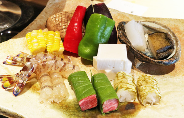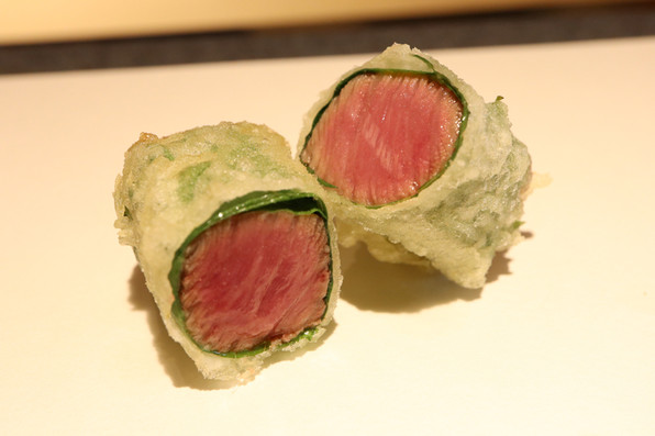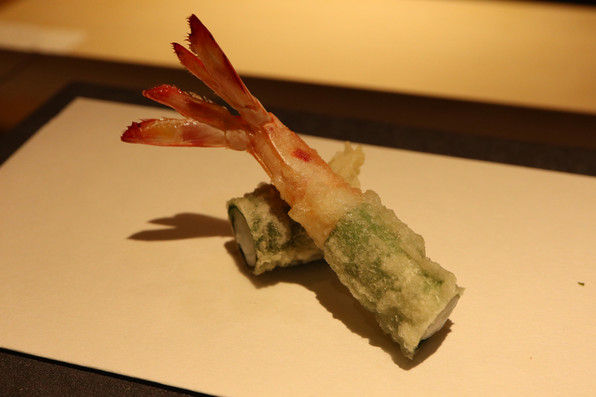 さっぱりからりと揚げられた水茄子、てっぺんは衣をつけずに揚げることで水分を飛ばしたという徳島の天恵菇の椎茸など食感に驚き、白海老白板昆布巻きにカヴィアをのせたものや、平井牛フィレの大葉巻きは瞠目の美味と絶句しました。