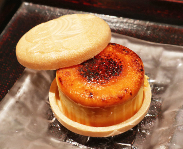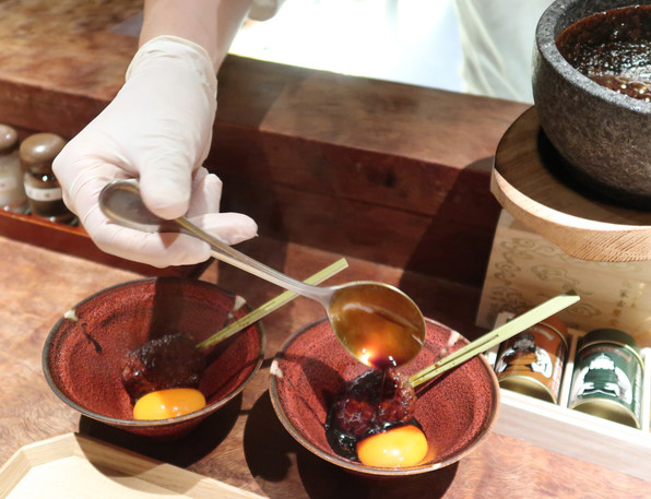 ●鴨と鶏もも肉のつくねの、フォンドヴォーとバルサミコのソース焼き、丹後のあか卵と。