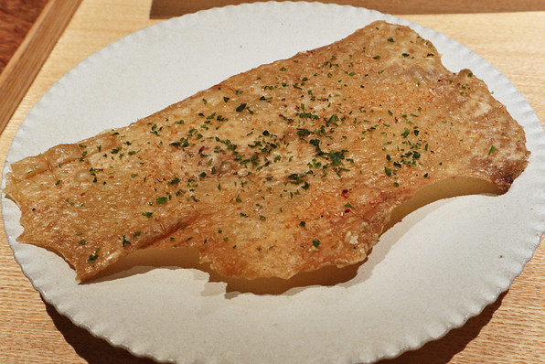 ●桜海老のパウダーで風味付けした、鶏の皮のパリパリ煎餅
