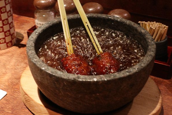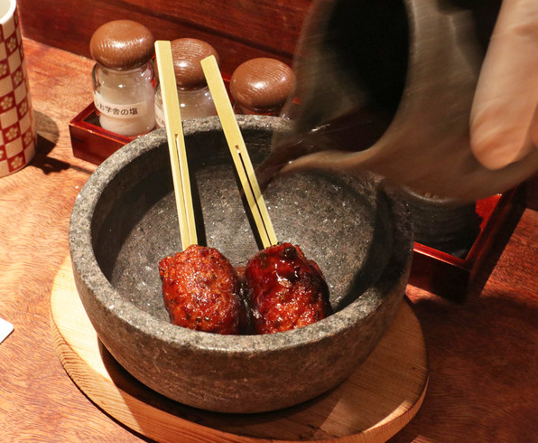 ●鴨と鶏もも肉のつくねの、フォンドヴォーとバルサミコのソースでぐつぐつ石焼き。卵黄と共に。