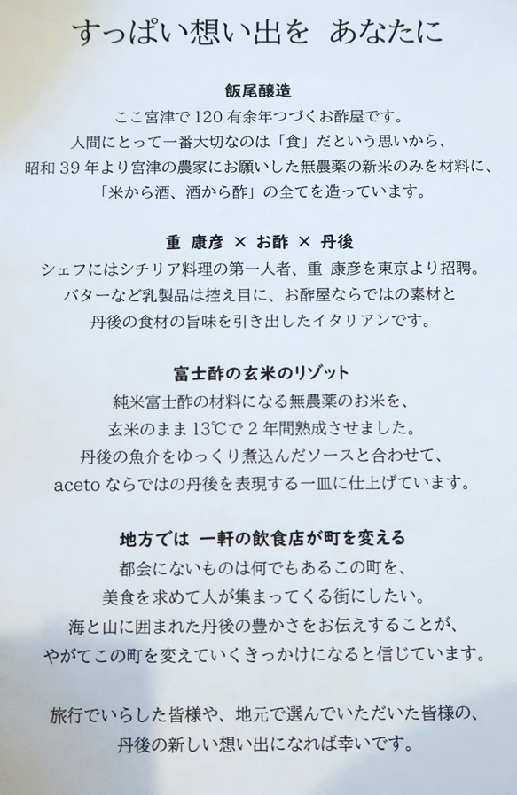 先週6月4日(木)、丹後地方は宮津、富士酢の「飯尾醸造」さんと、「飯尾醸造」さんが経営されるイタリア料理店「aceto」、そしてこのたび新たにオープンされる寿司店「すし長蔵」に取材に伺いました。
