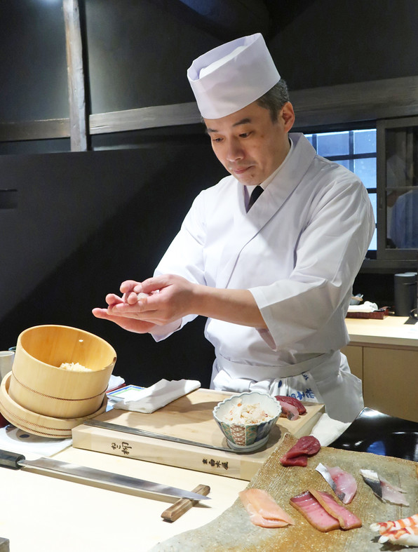 ●宮津に移り住んで、この「すし長蔵」の料理長となられるのは明石洋一さん。アメリカで10年以上、日本に戻って六本木で1年少しのキャリアを積まれた後、こちらに就任されたということです。握るシャリは、「飯尾醸造」さんの、15年ものの赤酢を使用、今まで握っていたお寿司とはがらりと変わったということです。