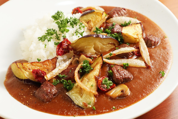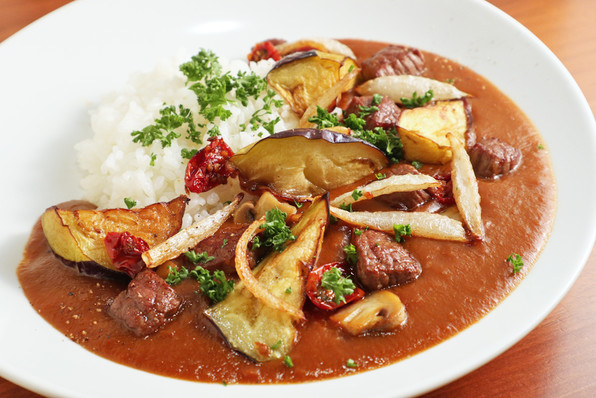 ごろんごろんと入った黒毛和牛肉に、京都の夏の味、賀茂茄子が旨みを添えて、贅沢感があります。