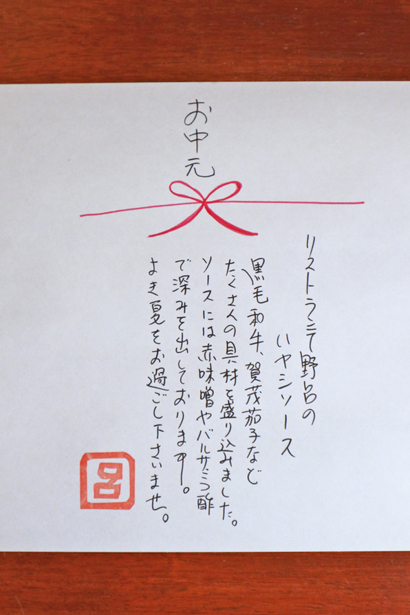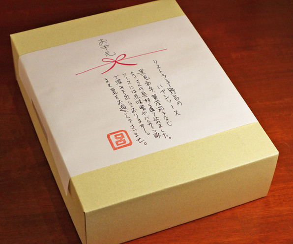 箱入りで、シェフ・野呂和美さんの手書きのし紙がかけられます。