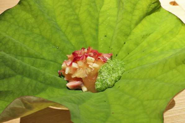 ●蓮の葉に、ほっき貝、おくら、茗荷、酢のジュレ